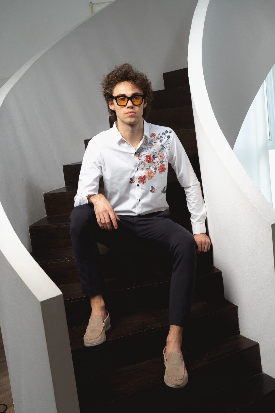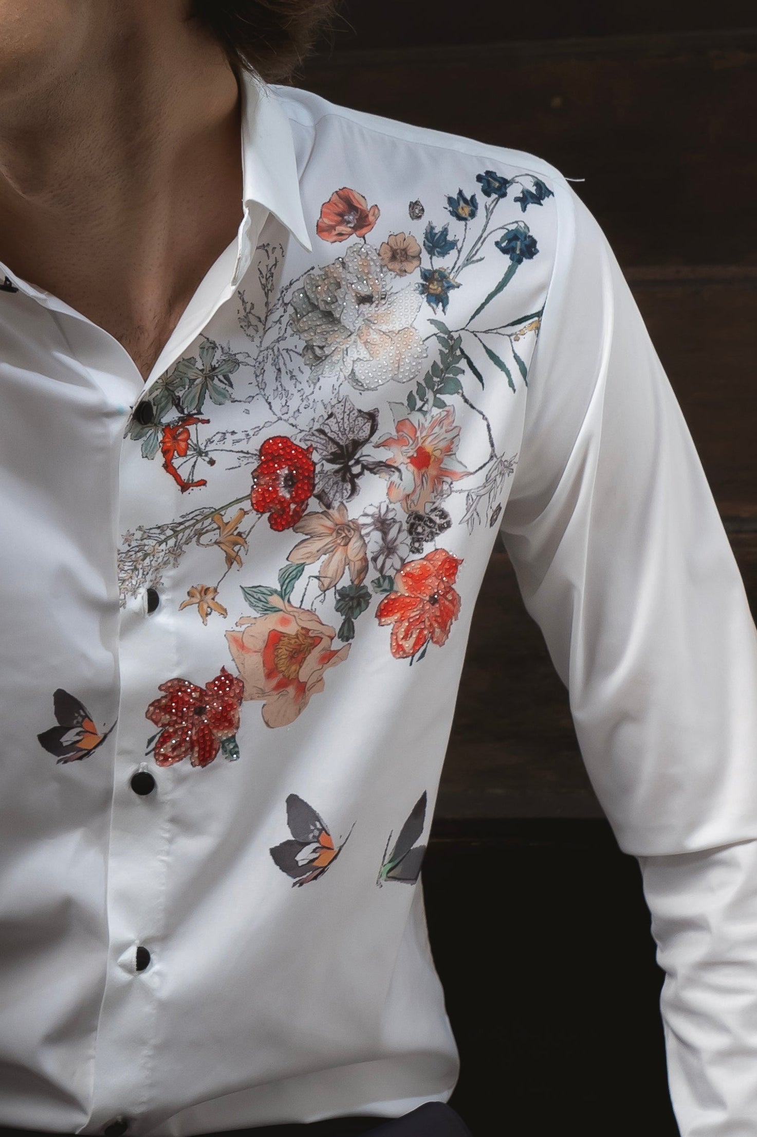 The Lustre Bloom shirt is crafted from premium satin, designed to bring a polished edge to your evening wear. The delicate floral motif on the chest is enhanced with diamond embellishments, adding a touch of understated luxury. Smooth, refined, and radiant, perfect for nights that demand sophistication.