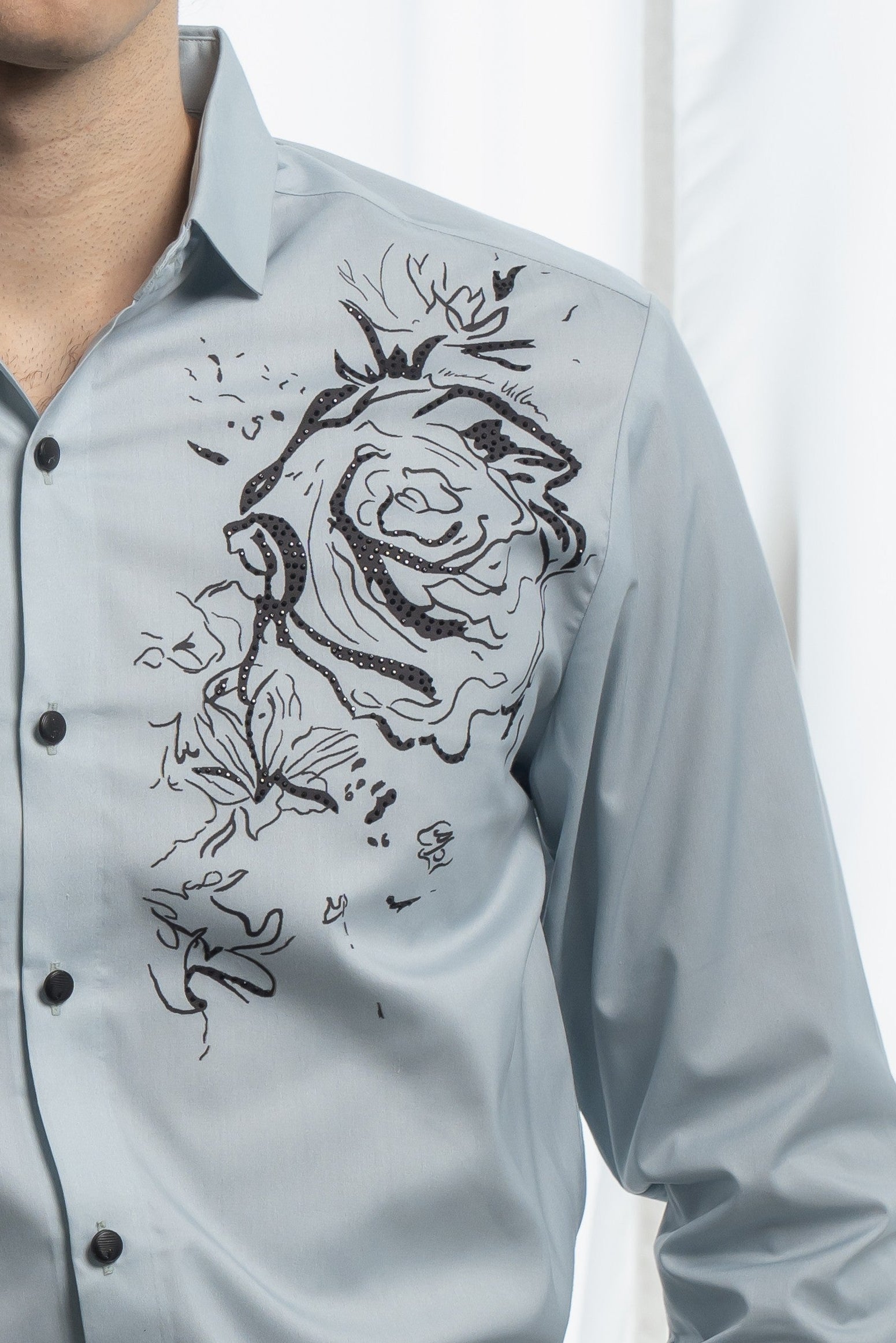 The Blue Mirage Shirt is crafted from premium light blue satin, featuring a contrasting abstract floral motif adorned with studded diamonds. Its smooth, lustrous finish and tailored fit make it a standout piece for refined evening wear. Perfect for nights that demand bold sophistication with a touch of artistry.