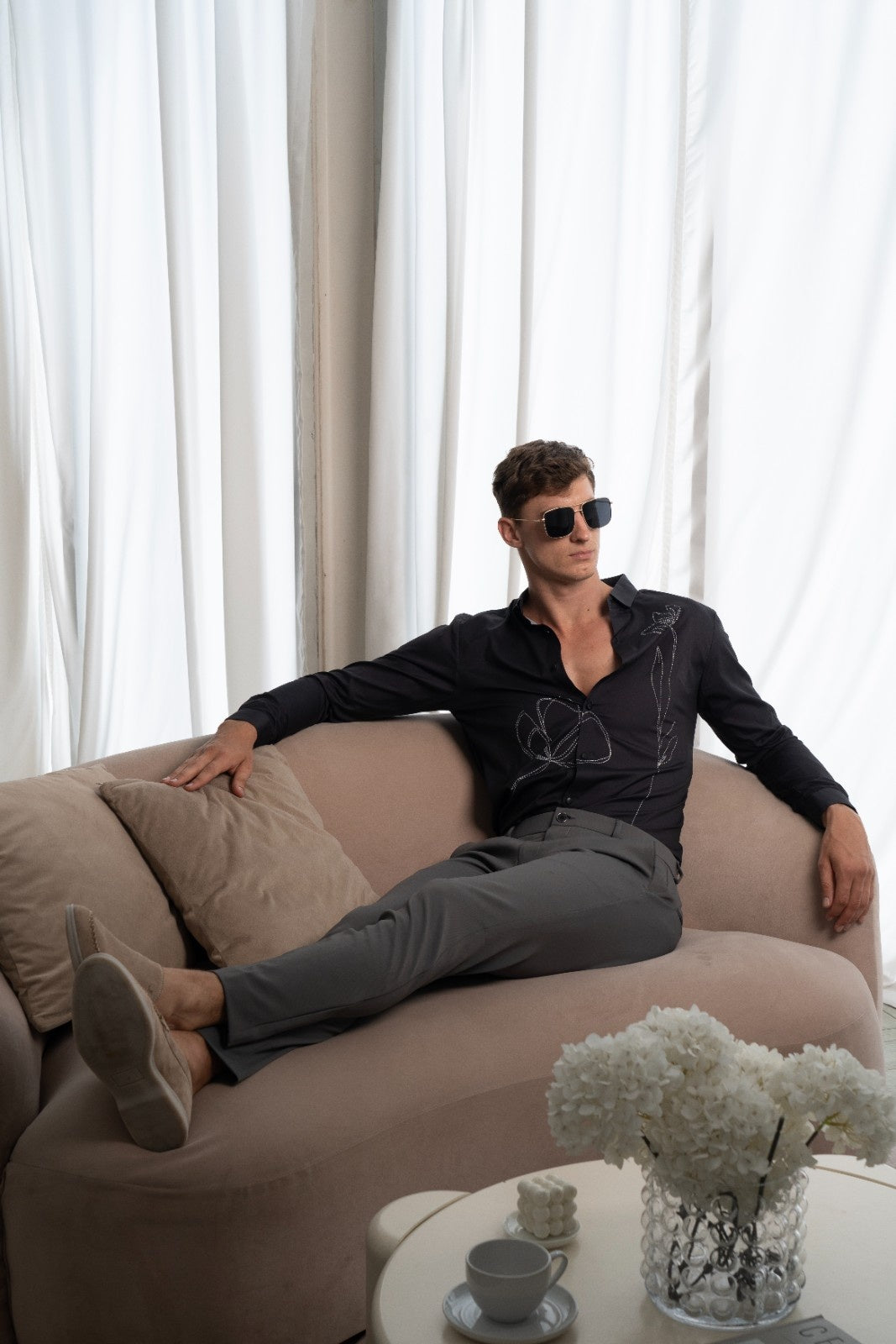 The Starlight Flora Shirt is crafted from premium black satin, featuring a striking floral motif formed with contrasting diamond studs. Its smooth, lustrous finish and tailored fit make it a standout piece for refined evening occasions. Perfect for nights that call for bold elegance and subtle luxury.