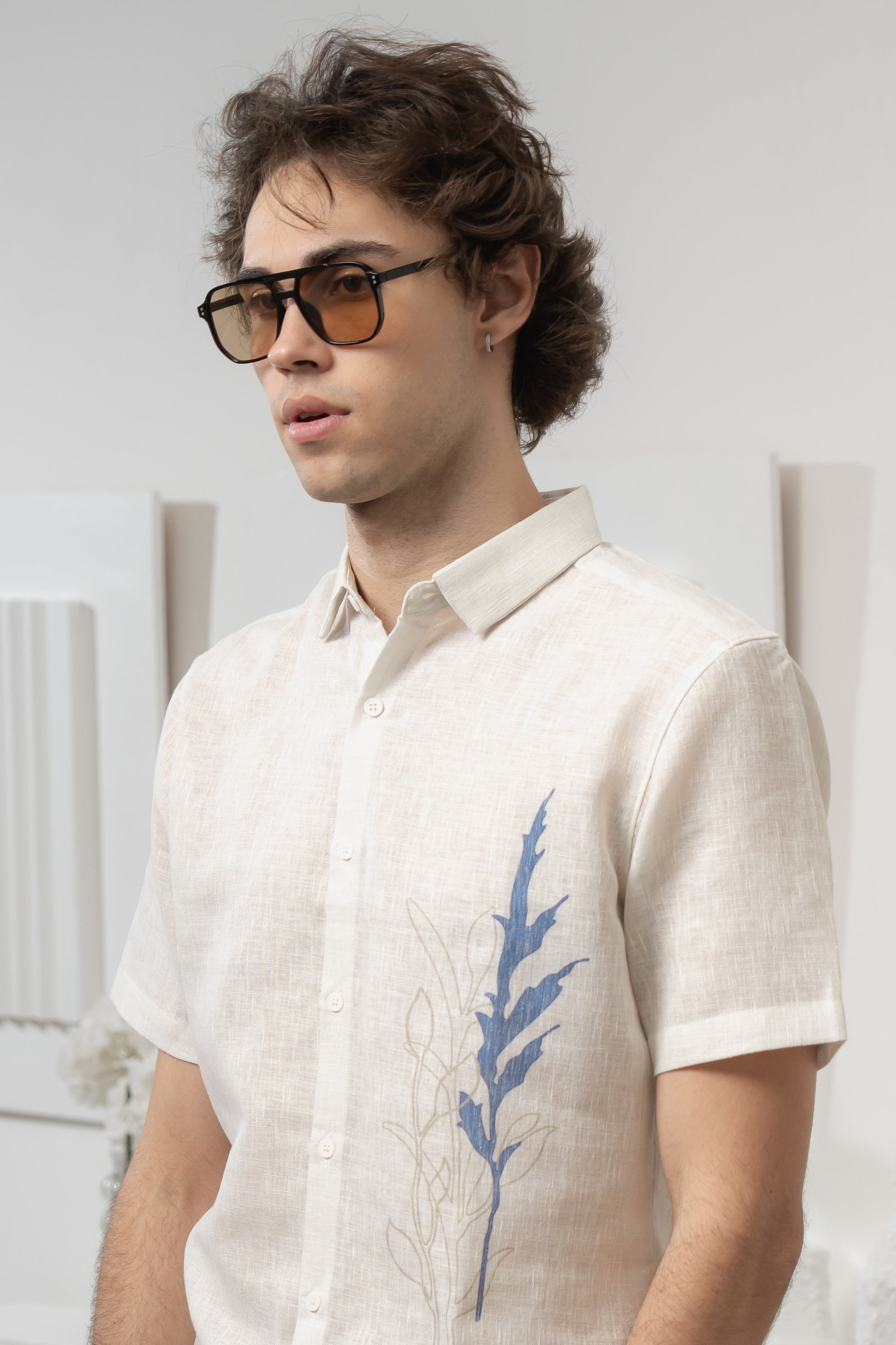 The Inkflora Linen Shirt fuses minimalism with abstract artistry. Its crisp white base is accented with a subtle line art botanical motif on the chest, creating a modern, eye-catching detail. Crafted from breathable linen, it ensures lightweight comfort and a relaxed fit, ideal for effortless summer styling.