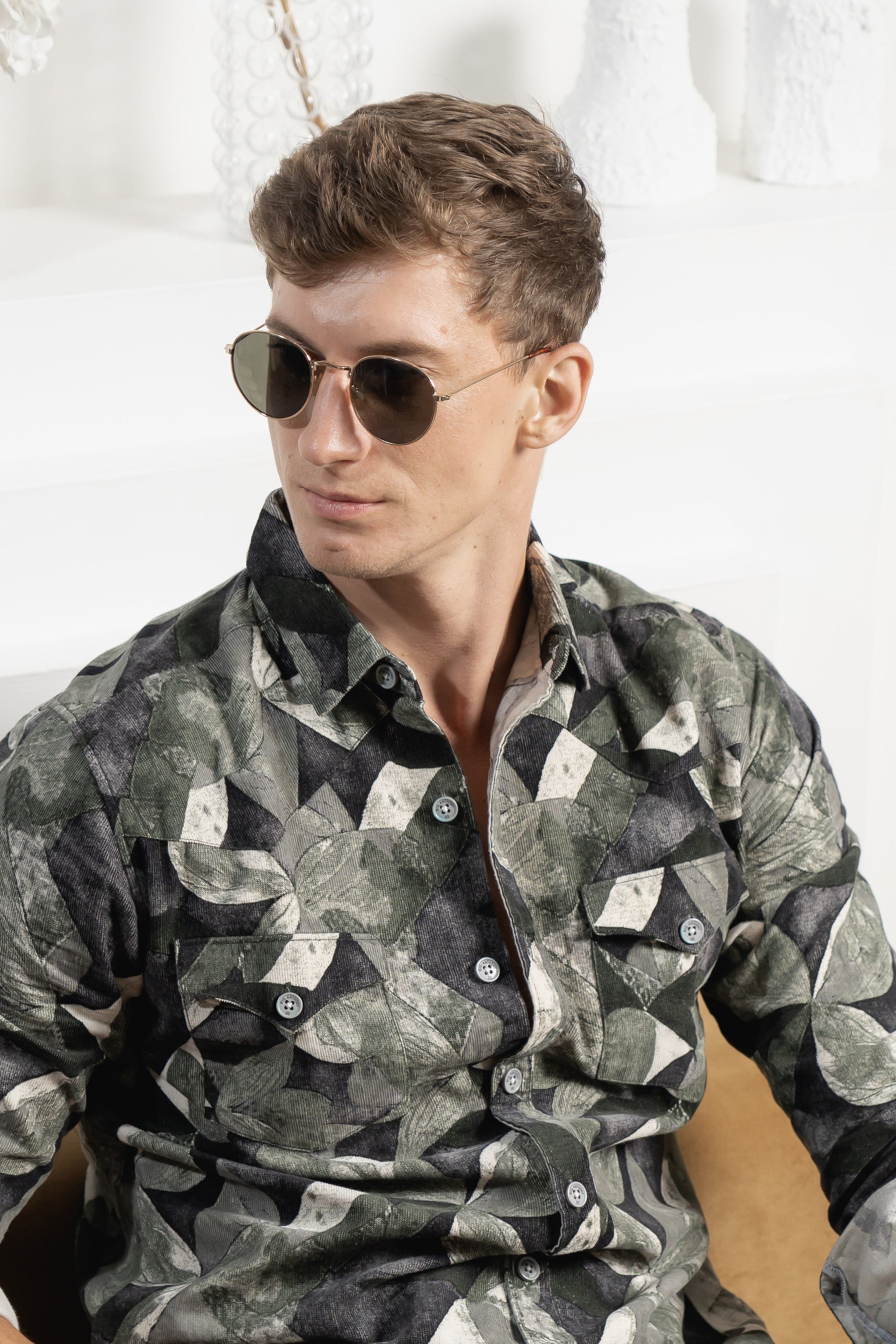 The Shadowbloom shirt brings a refined edge with its deep black corduroy base. Olive green and grey floral motifs add a subtle yet striking contrast, blending nature-inspired elegance with contemporary flair. A statement piece for sophisticated evenings and beyond.